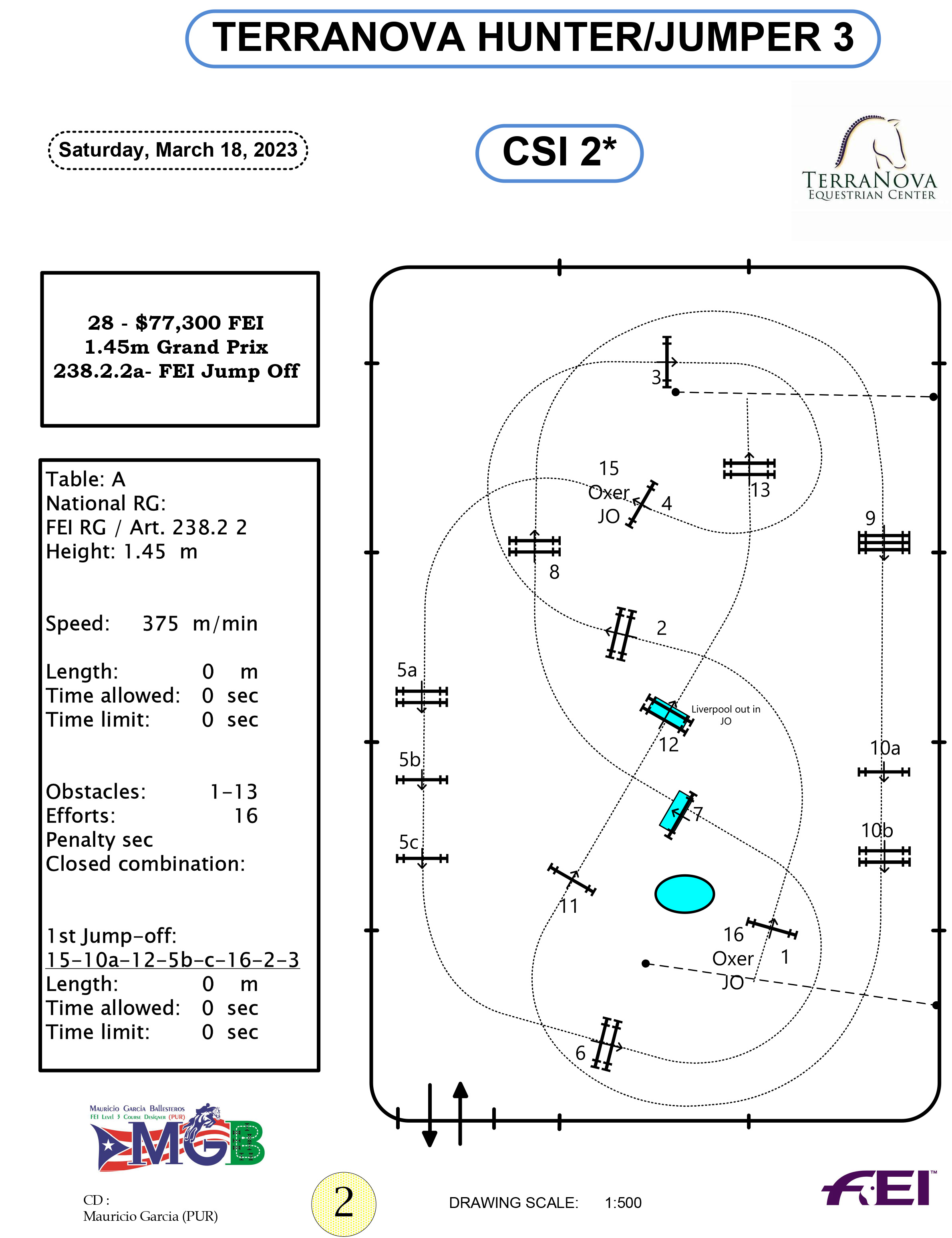 Forty-five horse-and-rider combinations contested Mauricio Garciaโs (PUR) FEI 2* course of 16 jumping efforts. The track included a triple bar oxer to a double combination, a triple combination and several maximum-height and width oxers.